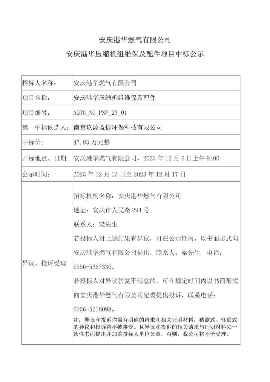 安慶港華壓縮機(jī)組維保及配件項(xiàng)目中標(biāo)公示