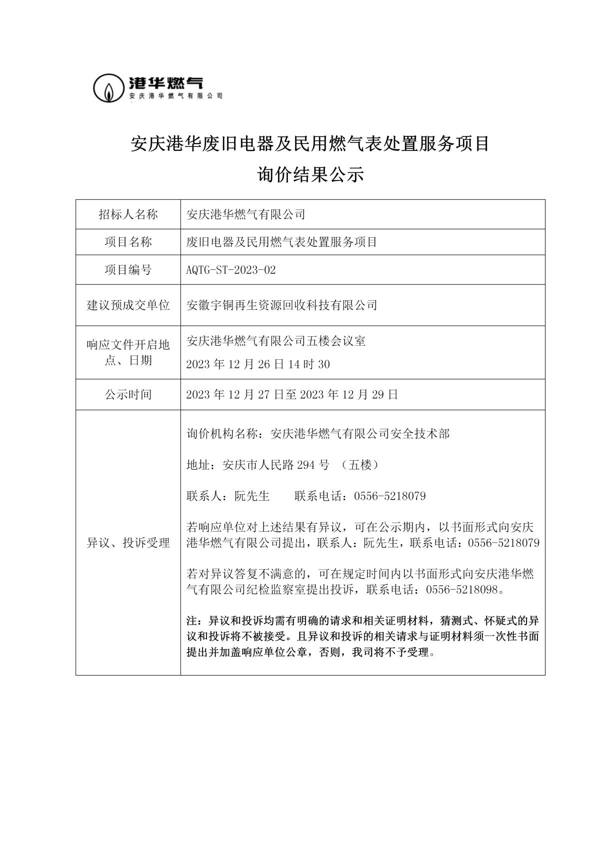 安慶港華廢舊電器及民用燃?xì)獗硖幹梅?wù)項(xiàng)目詢價(jià)結(jié)果公示
