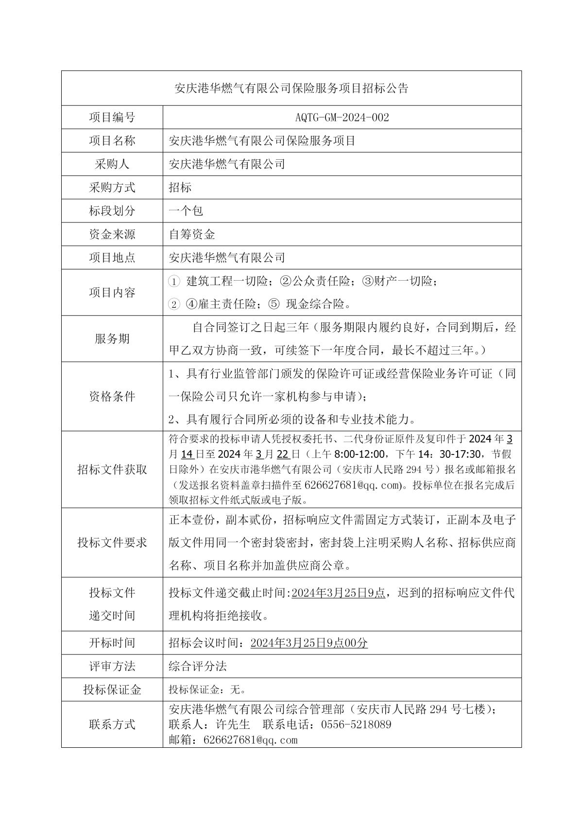 安慶港華燃氣有限公司保險服務(wù)項目招標公告