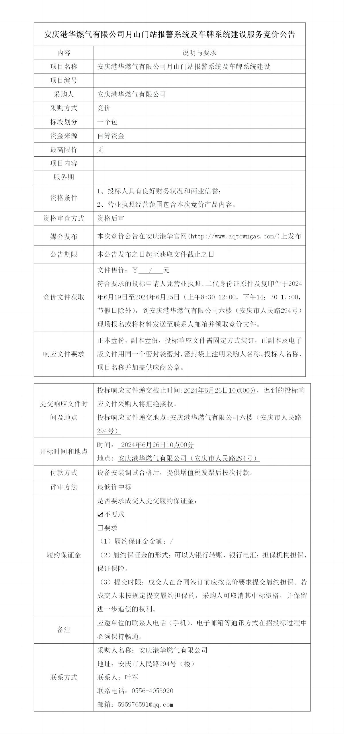 安慶港華燃?xì)庥邢薰驹律介T站報(bào)警系統(tǒng)及車牌系統(tǒng)建設(shè)服務(wù)競(jìng)價(jià)公告