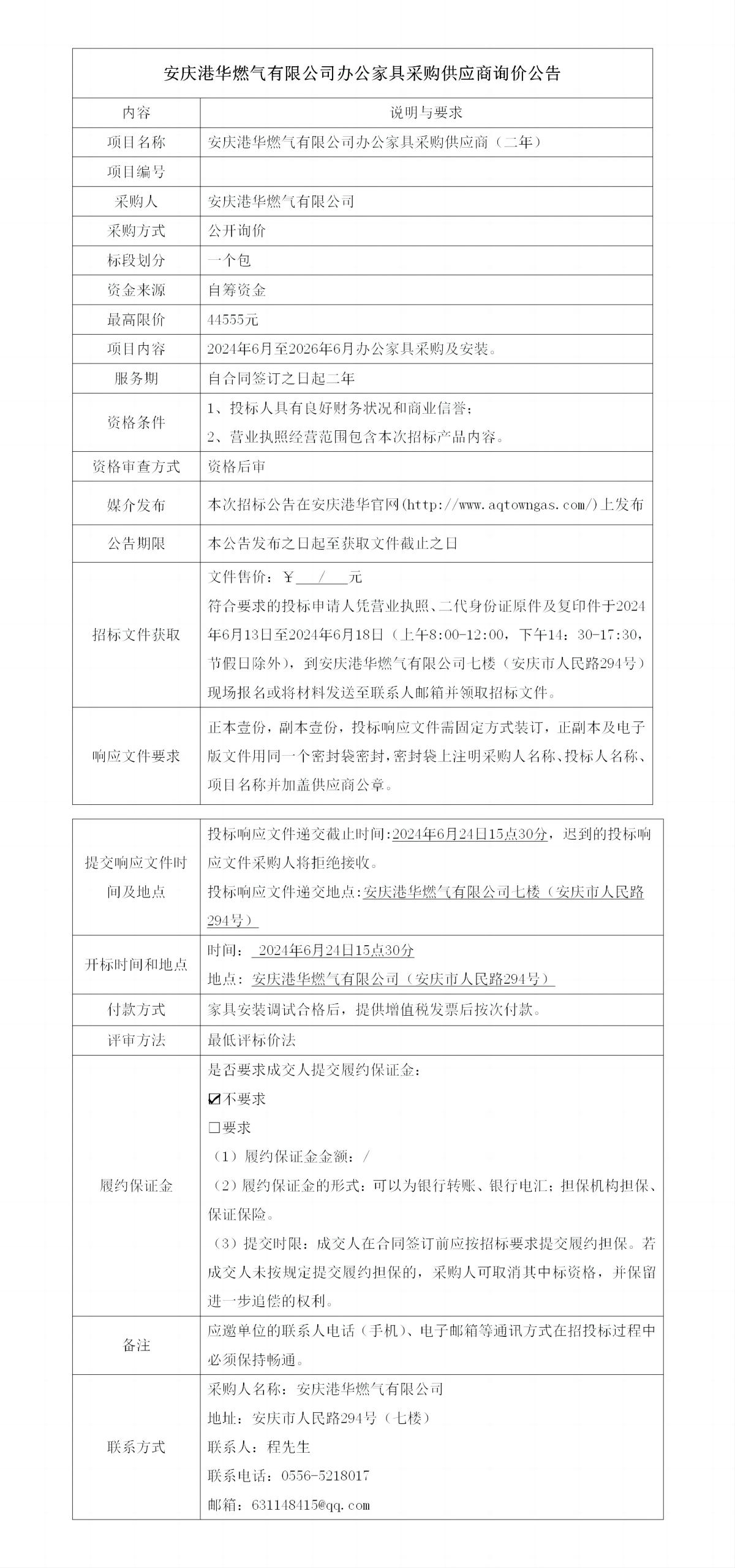 安慶港華燃氣有限公司辦公家具采購供應商詢價公告