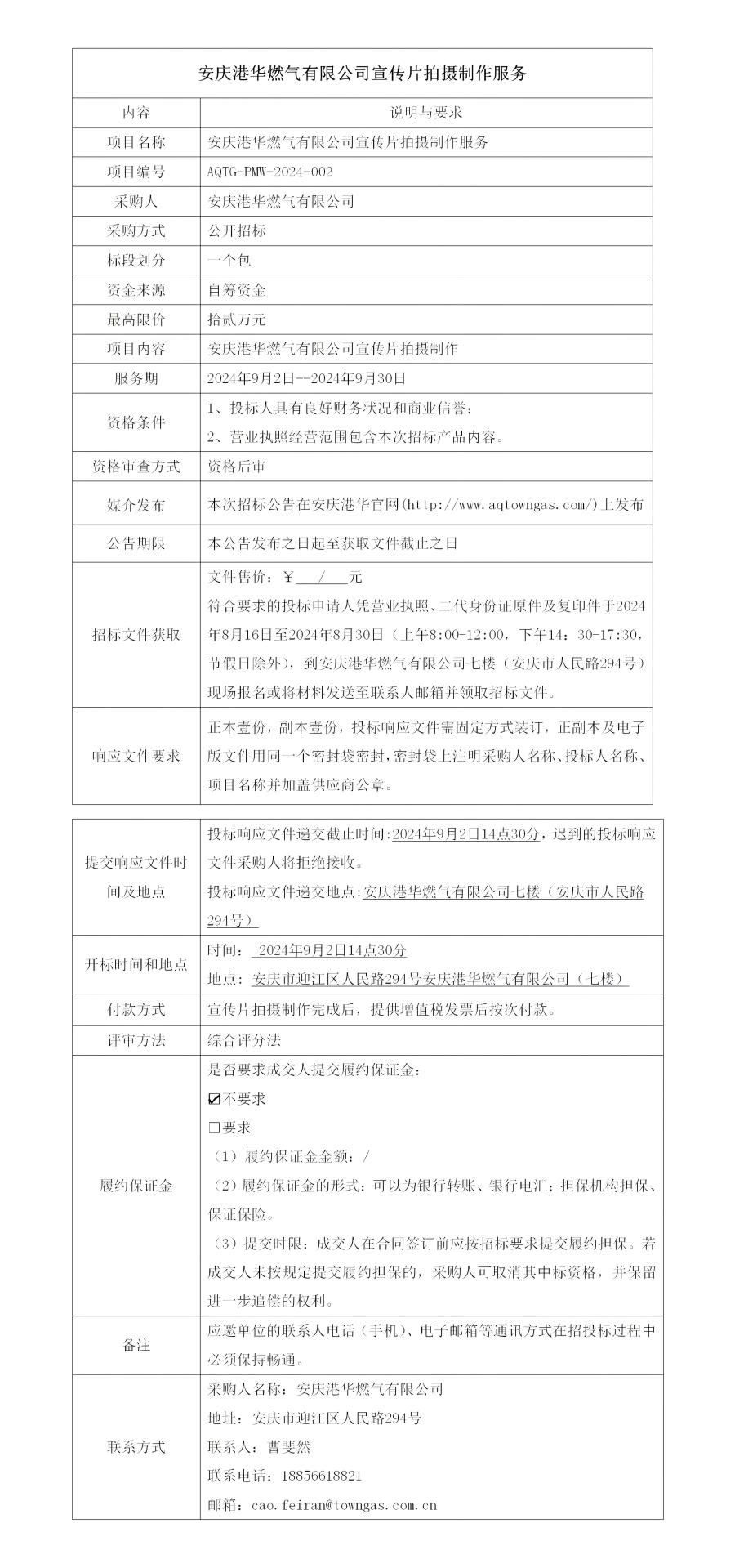 安慶港華燃氣有限公司宣傳片拍攝制作服務(wù)項目招標公告