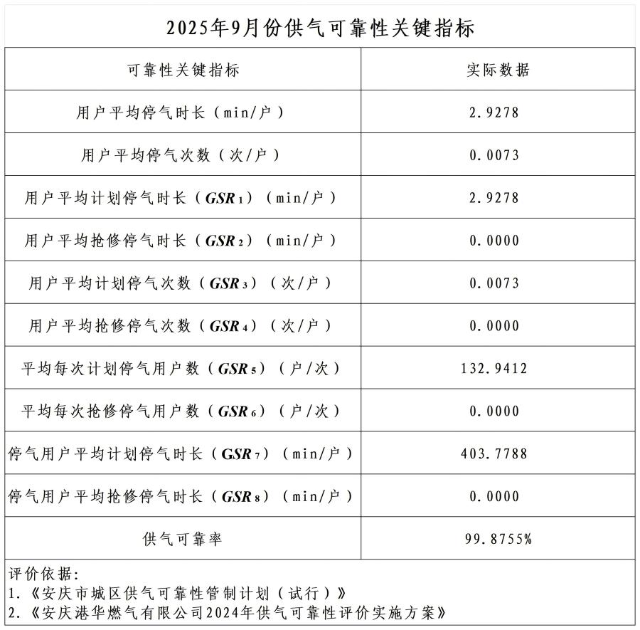 2025年9月份供氣可靠性關鍵指標