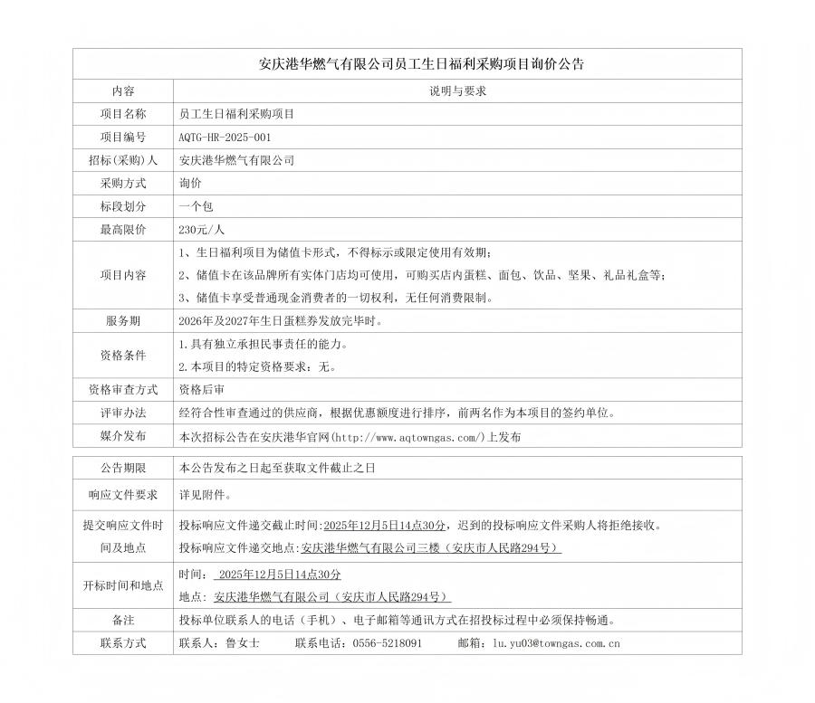 安慶港華燃氣有限公司員工生日福利采購項目詢價公告