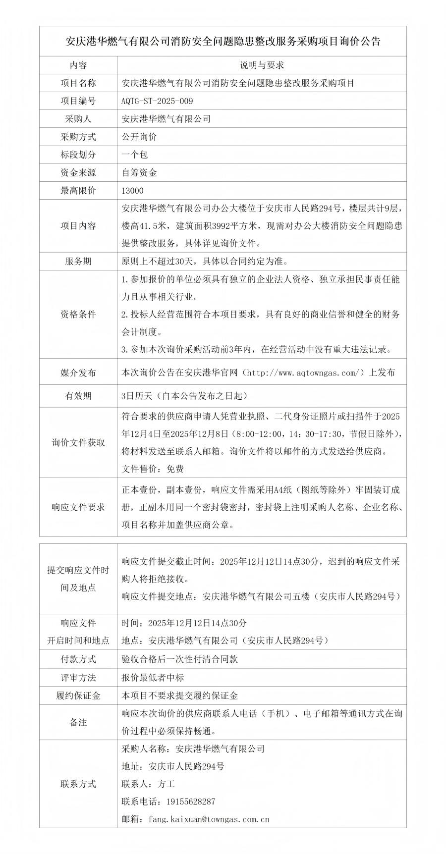 安慶港華燃?xì)庥邢薰鞠腊踩珕?wèn)題隱患整改服務(wù)采購(gòu)項(xiàng)目詢(xún)價(jià)公告